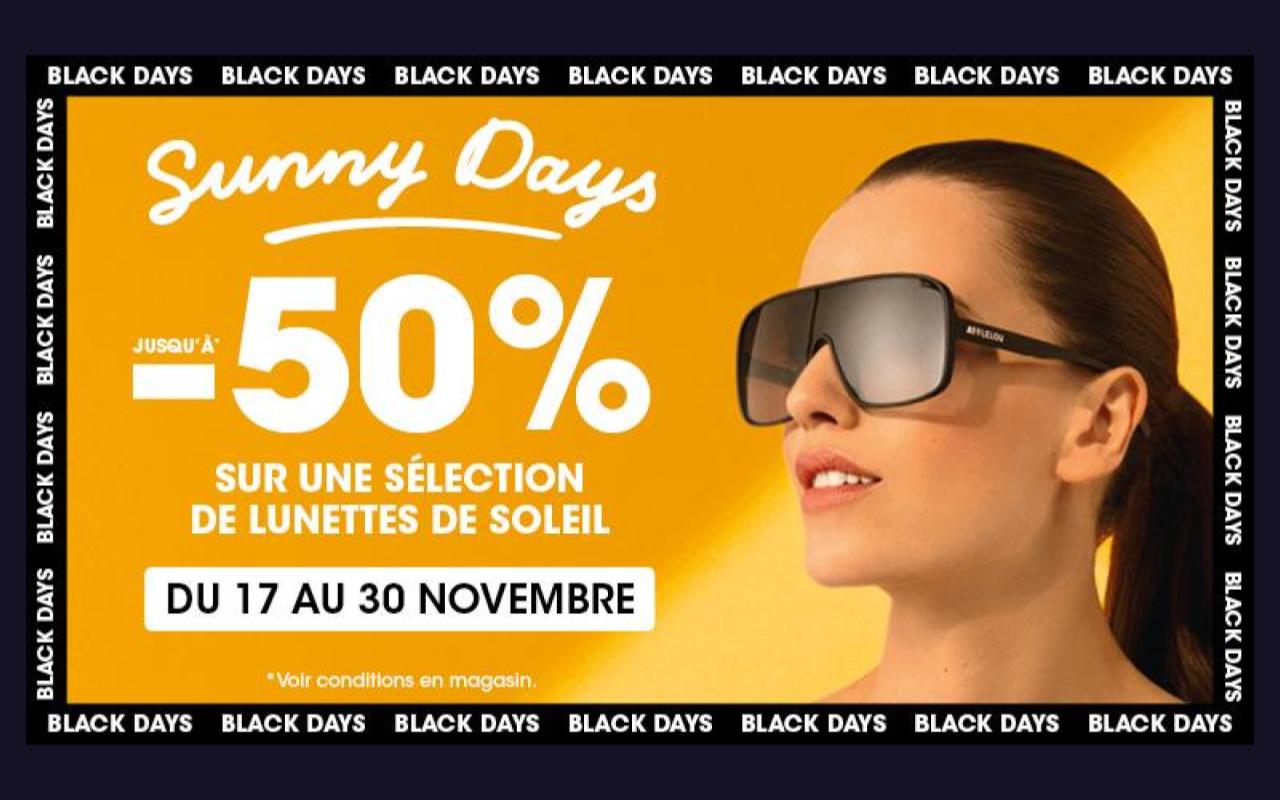 *Remise en caisse jusqu’à -50% sur une sélection de lunettes de soleil sans verres correcteurs identifiées par une pastille de couleurs, en fonction de la réduction appliquée, dans la limite des stocks disponibles (les sélections peuvent différer entre les magasins).