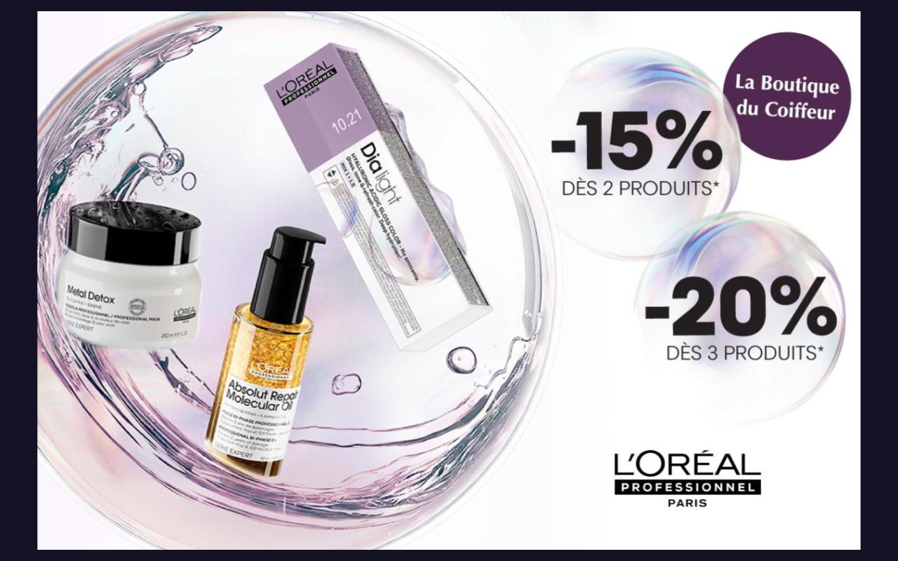 En ce moment -15% dès 2 produits achetés et -20% dès 3 produits achetés sur les gammes Series Expert et Dialight de L’Oréal Professionnel*